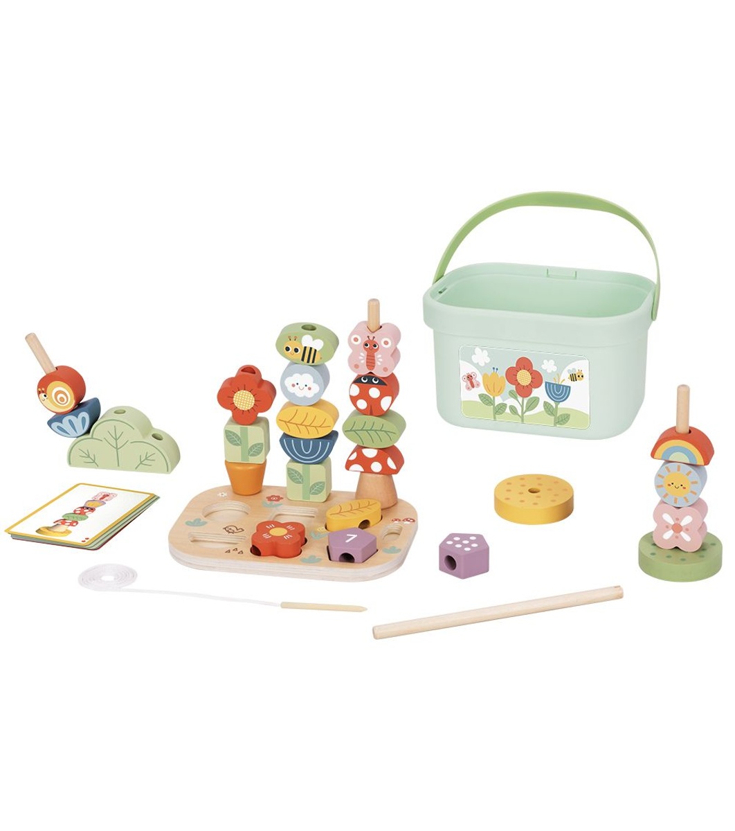 Представяме Ви игра за нанизване Градина – цветно приключение за сръчни ръчички - дървени фигурки на цветя, пчелички, градински инструменти и плодове, събрани в една кутия за безкрайно нанизване и игри!