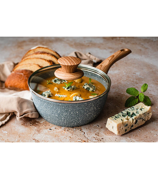Тялото на съда от кован алуминий гарантира лекота на използване и най-добро разпределение на топлината, докато специалното покритие дава цялото качество на готвенето на камък.