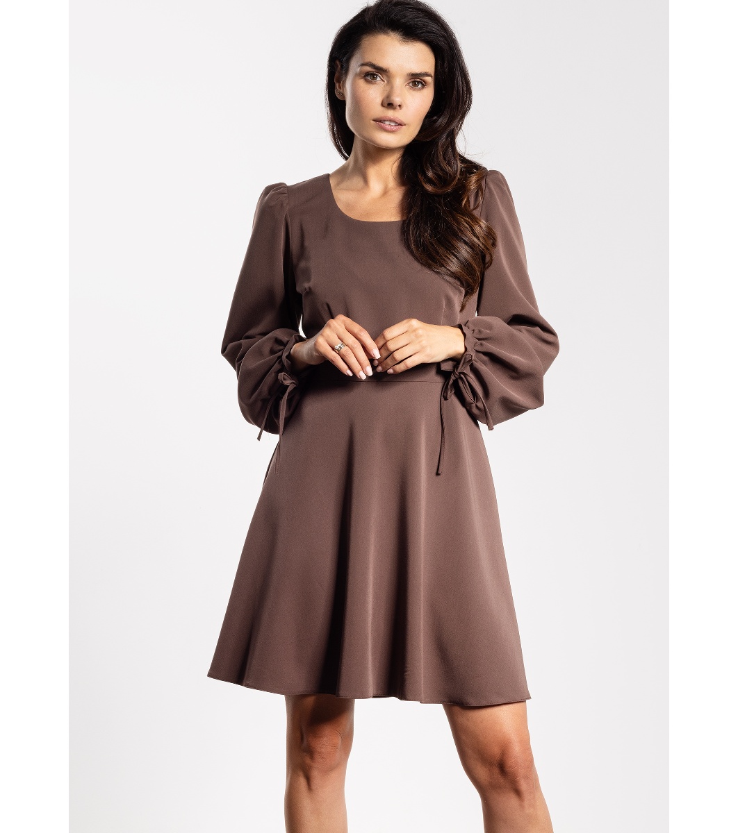 Къса разкроена рокля с дълъг буфан ръкав. Предната част е с леко заоблено деколте и декоративно връзване в талията. Ръкавите завършват с маншет с ластик и връзки. Гърбът е гладък, с шев по линията на талията. Полата е клоширана, пада свободно и образува леки гънки.