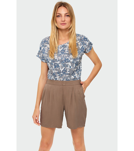 Дамски шорти с дължина над коляното и свободна кройка. Моделът е с широк колан и предни плохи. Закопчаването е отпред с цип и копче. Гладък десен без допълнителни декоративни елементи.