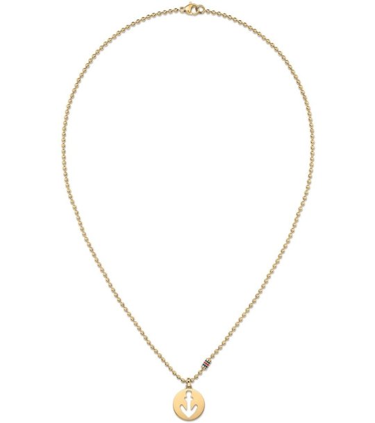 Елегантно колие с кръгла висулка, представяща изрязана котва. Закопчалката е тип карабинер, осигуряваща лесно закопчаване и сигурност.