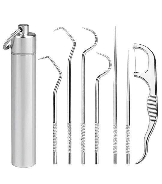 • Освен това са включени преносим конец за зъби и почистваща игла за дълбоко почистване на зъбите и венците. • Всички елементи на комплекта са изработени от висококачествена неръждаема стомана за максимална издръжливост и устойчивост на корозия.