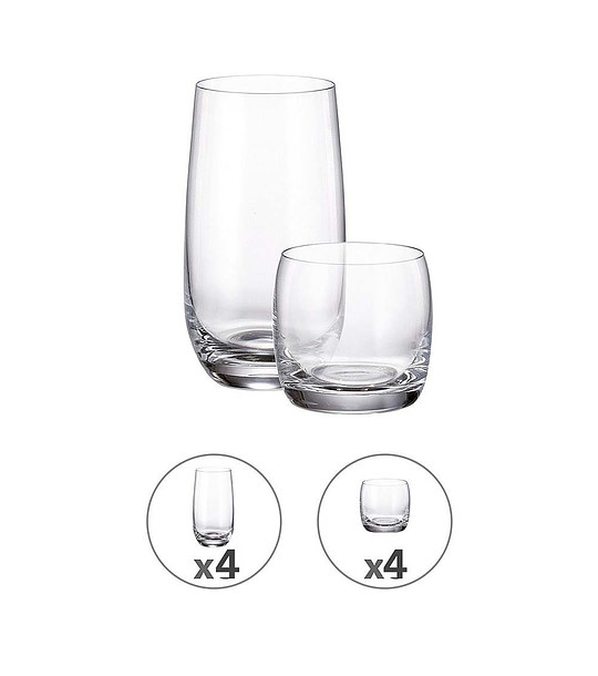 Комплектът съдържа: чаши за вода - 4 броя с вместимост 470ml чаши за уиски - 4 броя с вместимост 350ml