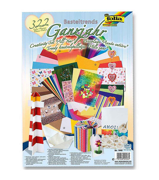 Комплектът съдържа 322 части: 8 бр. цветни хартии 130 g/ m² с размери 25 х 35 см; 4 бр. цветен картон 220 g/ m² с размери 25 х 35 см; 5 бр. дизайнерски картон 270 g/ m² с размери 25 х 35 см; 1 бр. фото хартия с цветовете на дъгата 300 g/ m² с размери 25 х 35 см; 3 бр. прозрачна хартия 115 g/ m² с размери 17.5 х 25 см, различни цветове; 6 бр. велпапе с размери 25 х 35 см в различни цветове; 13 бр. цветни листове тишу хартия 20 g/ m² с размери 25 х 35 см; 50 бр. цветна хартия за оригами с размери 14 х 14 см; 4 бр. импрегнирана хартия, бяла с размери 20 х 20 см; 140 бр. разноцветни лентички за квилинг 8 мм х 34.5 см; 30 бр. декоративни камъчета; 40 бр. декоративни елементи от EVA пяна; 13 бр. 3D стикери; инструкции за работа и модели за изработка.