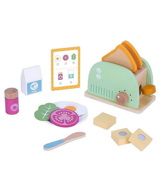 Комплектът от 14 части разполага с всичко необходимо за перфектната закуска: две филийки препечен хляб, масло и разнообразни гарнитури: яйце, домат и маруля. И още - дървен нож, конфитюр за намазване, освежаваща напитка и мляко.