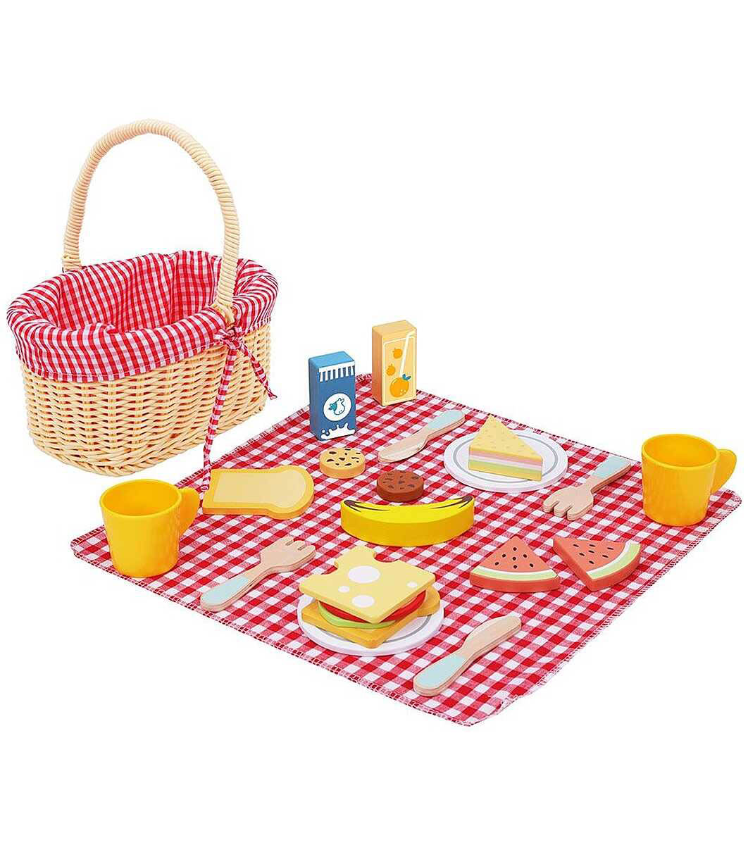 В нея ще намериш: стилна карирана покривка, комплект чаши, прибори, чинии, банан, диня, сандвич, кашкавал...