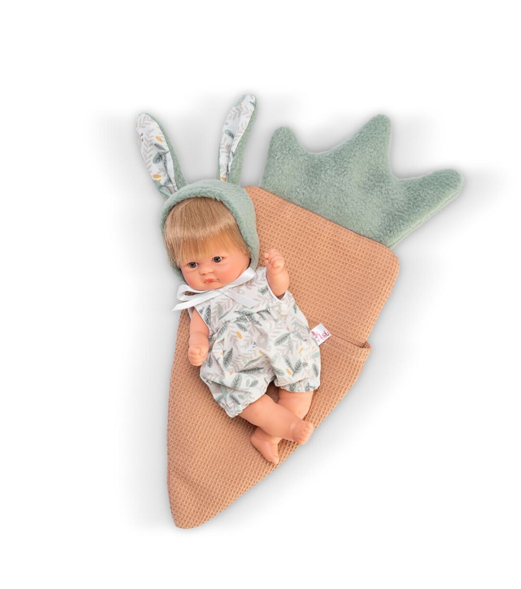 Запознайте се с очарователната кукла Чикита от сеията Bomboncin. Тя има сладки заешки уши и чувалче за сън във формата на морковче.Чикита е най-малкото и сладко бебе в колекцията на испанската марка Asi! С височина от 20 см, напълно гумирано тяло и подвижни крайници, тази кукла е идеална за малките ръчички и за дълги часове на игра. Ще бъде верен приятел, който ще донесе радост и топлина на всяко дете.Професионалистите от Asi са се погрижили за реалистичността на изработката на кукличката. Възпроизвели са изразителните черти на лицето и гънките по крачетата, така че куклата е като истинска.