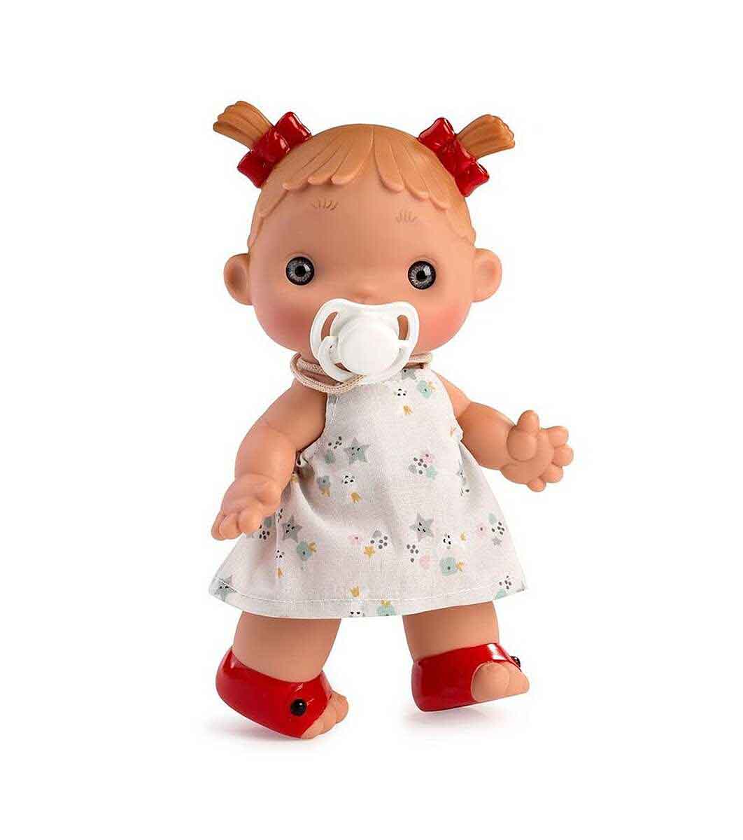Даниела е мека и приятня на допир, изработена изцяло от винил. Висока е 23 см. Облечена е с рокля на звездички, червени обувки и има опашчици. За да бъде още по-интересна има биберон.