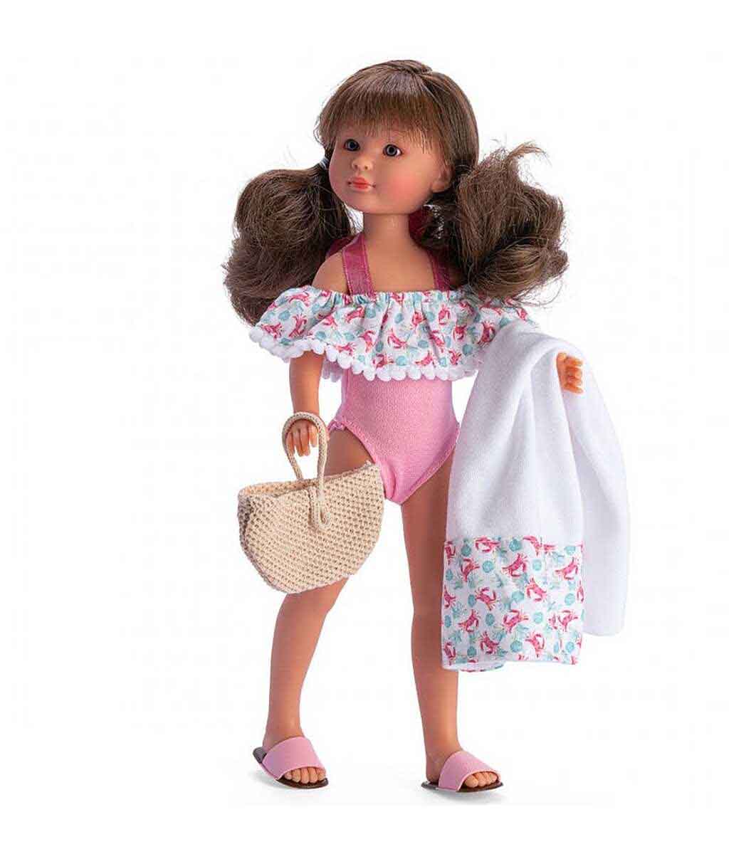 Куклата носи плажна кърпа, чанта и розови чехли, които са чудесен завършек на елегантния й тоалет. Обувките и дрехите на куклата могат да се махат и свалят.