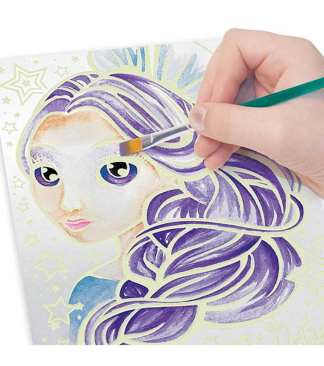 Комплектът съдържа: 5 вълшебни платна за оцветяване със светещи в тъмното контури; 12 акварелни боички; 2 бр. четки за рисуване; инструкции за оцветяване; разказ за феята Небулия на английски език.