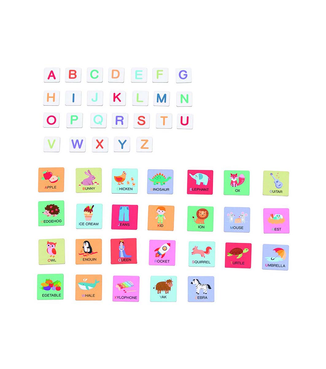 В удобна кутия с дръжка и магнитно затваряне, която при отварянето си се превръща в игрално поле с магнитна повърхност, ще откриете карти с картинка и дума на английски. С помощта на магнитните буквички, малчуганът трябва да подреди думичката от картите. Може да измисля и свои собствени, когато напредне с изучаването.