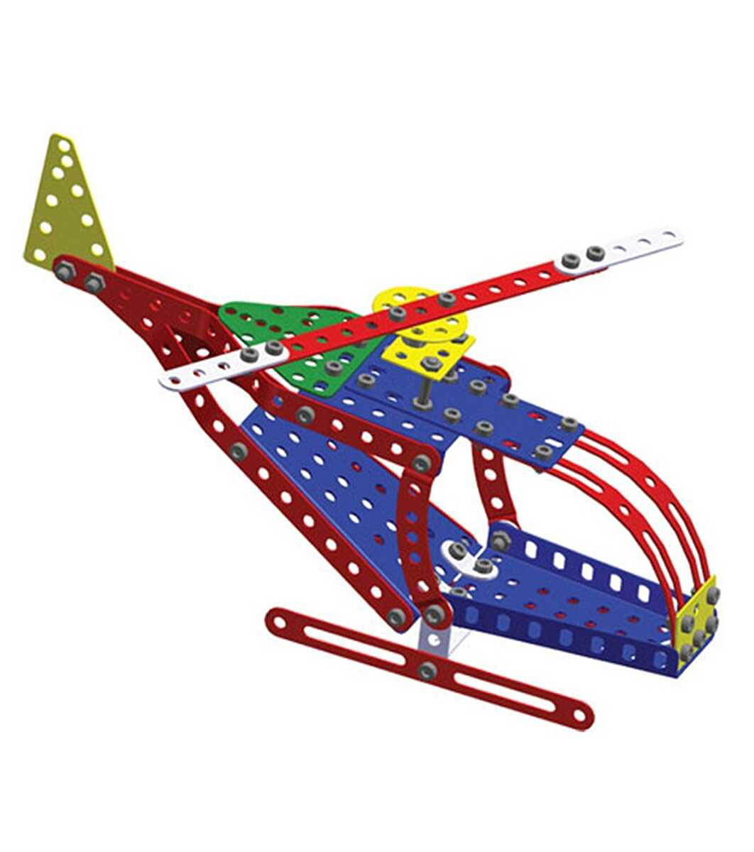Метален конструктор от 222 части, с който ще се научат как да сглобяват 10 модела хеликоптери, с помощта на плоскости, болчета и гайки.