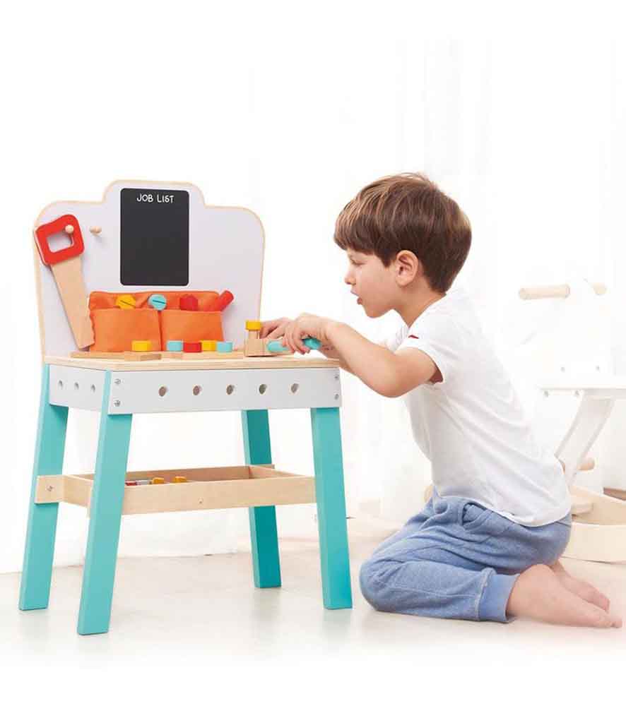 Детската работилница е в красиви цветове - оранжево и ментово зелено, в комплекта ще намерите 34 части, които можете да завивате, закрепвате с болтове или да чукате с чукчето - полезни дейности, които децата обожават.