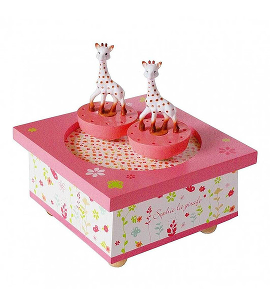 Навийте механизма на кутията, ще зазвучи музика. Поставете двете жирафчета върху кутията и наблюдавайте как се танцуват.