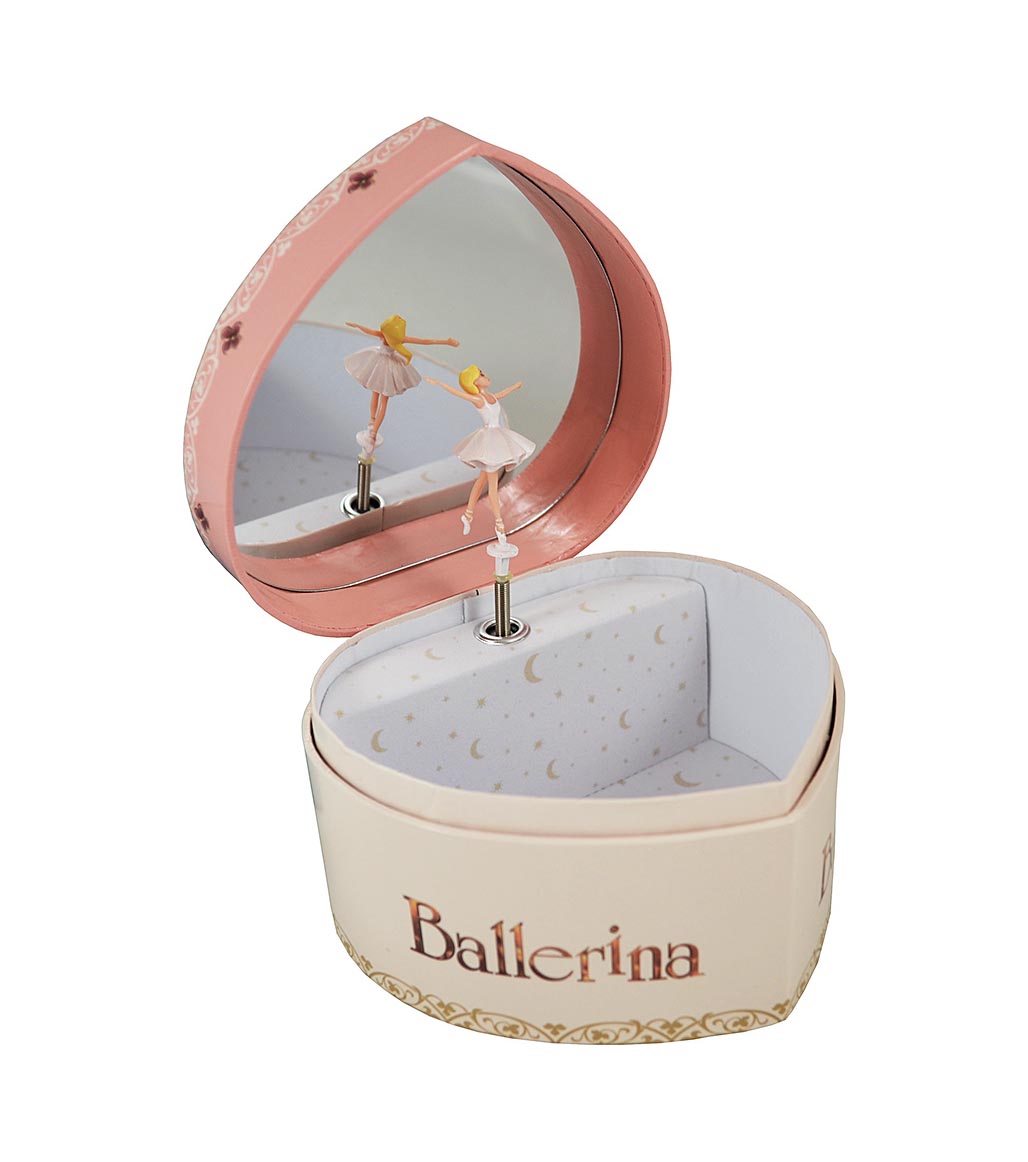 Когато детето отвори капака на музикалната кутията се показва фигурка на балерина, която започва да се върти в ритъма на музиката
