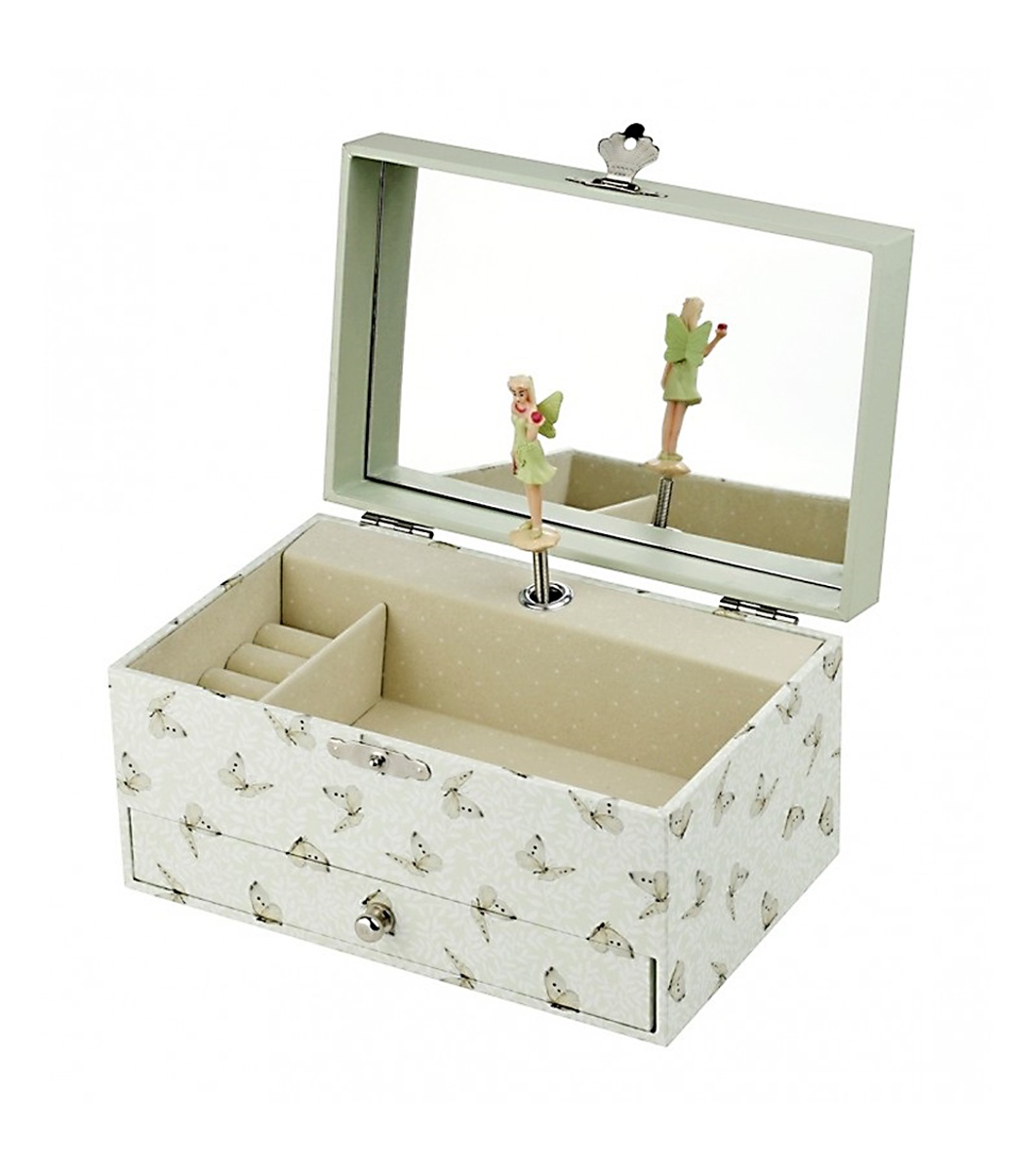 Тази музикална кутия с чекмедже, голямо огледало и отделение за пръстени ще удиви всяко малко момиче, което ще съхранява своите бижута и тайни там.