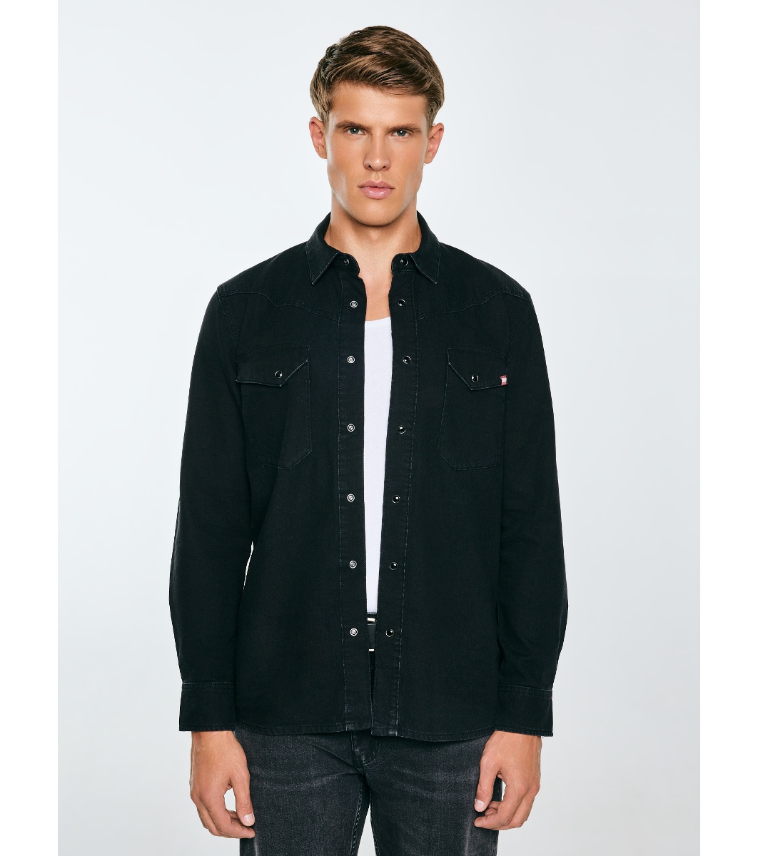 Моделът е с класическа яка и закопчаване с копчета отпред.