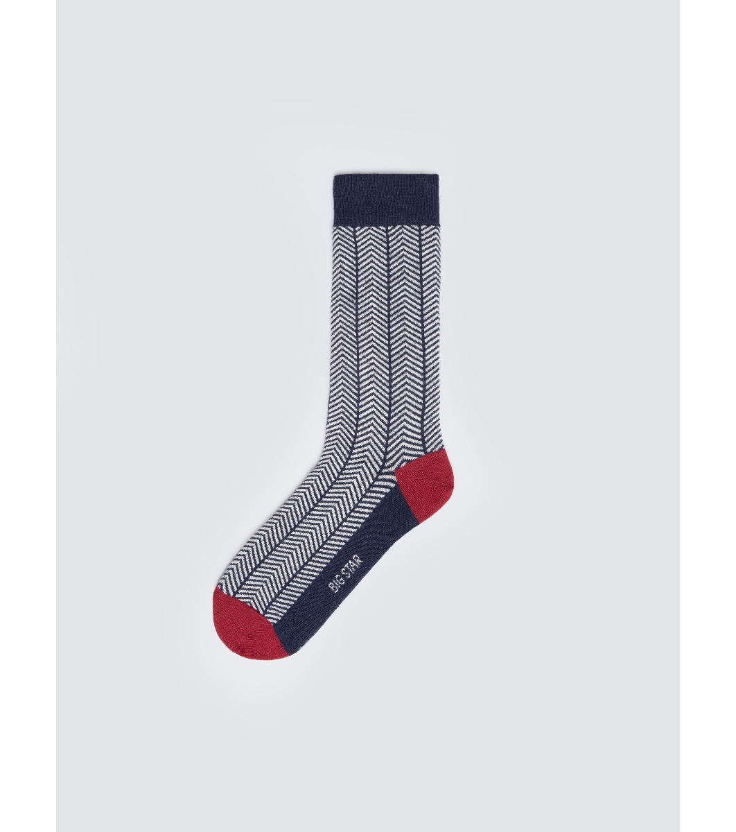 Дълги мъжки чорапи с шеврон мотив и контрастни пета и пръсти. Еластичен ластик в горната част.