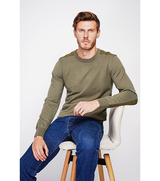 Пуловер от фино плетиво с текстилни платки при раменете и ръкавите