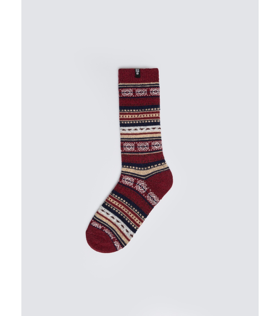 Чорапи с дължина до прасеца с многоредов жакардов десен и малко текстилно лого в горната част.
