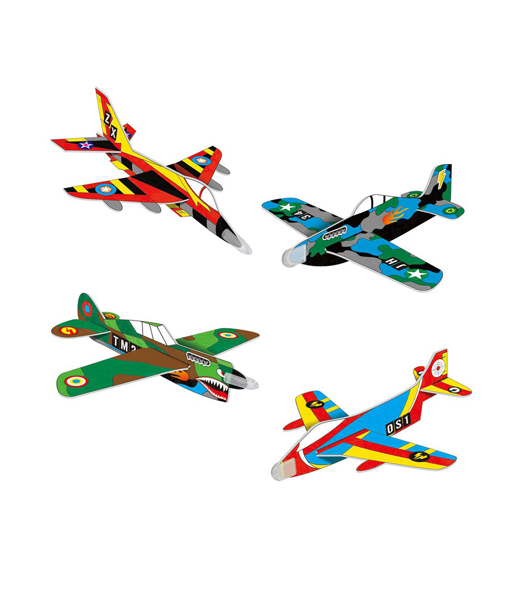 Направи лесно четири самолета, като съединиш отделните елементи, оцветиш и декорираш със стикери.