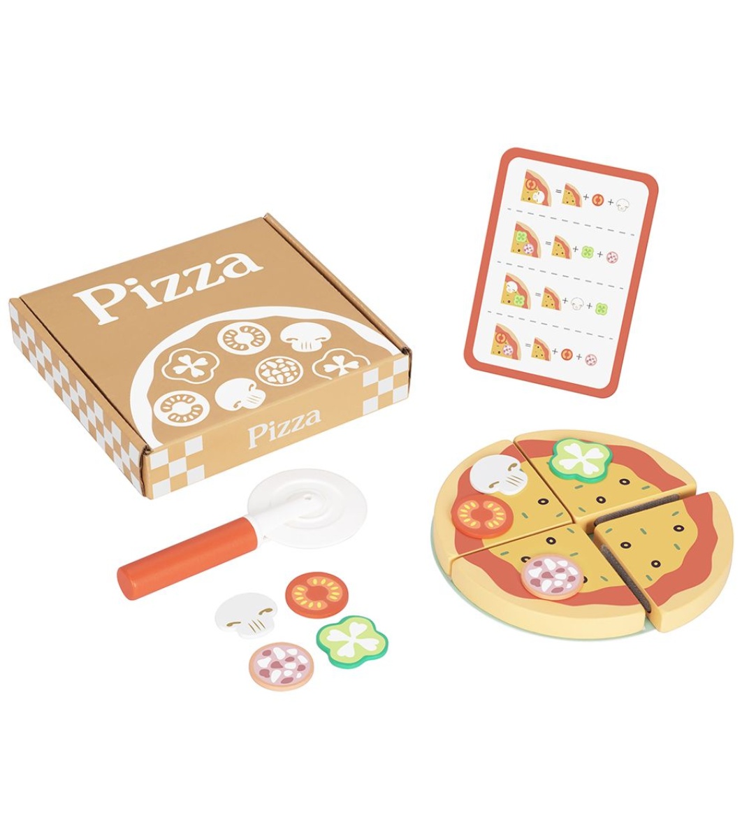 Комплектът включва 16 части: Блат за пица, който чака да бъде аранжиран. Нарязан е на 4 парченца с велкро лепенки за лесно „рязане“; Цветни продукти – 2 доматчета, 2 парчета гъби, 2 саламчета и 2 чушки; Нож за пица; Меню или бележка за поръчки; Поднос; Кутия за пица; Играта насърчава творческото мислене, развива моториката и координацията, подпомага социалните умения чрез ролеви игри .