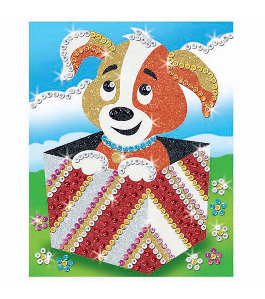 Комплектът съдържа рамкирана полистеренова основа, 6 шишенца с цветни блястящи пясъци, четка, цветни пайети, игли и инструкции.