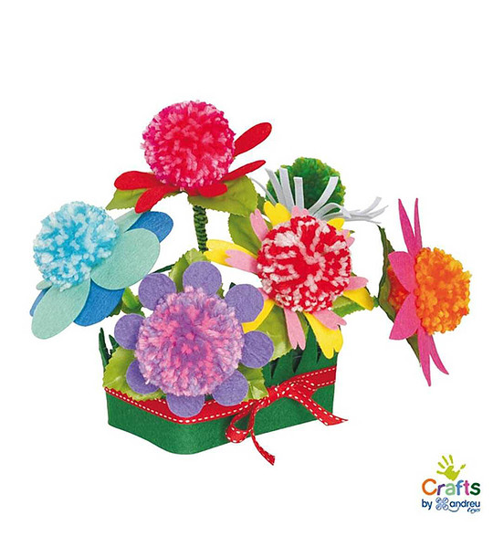 Съдържание: гъвкава тел, пластмасови форми за изработка на помпони, разноцветни прежди, изрязани от филц цветя и трева, лепило, двойно лепящо тиксо, листа от плат, панделка, пластмасова кутия и кубче-пиафлора.