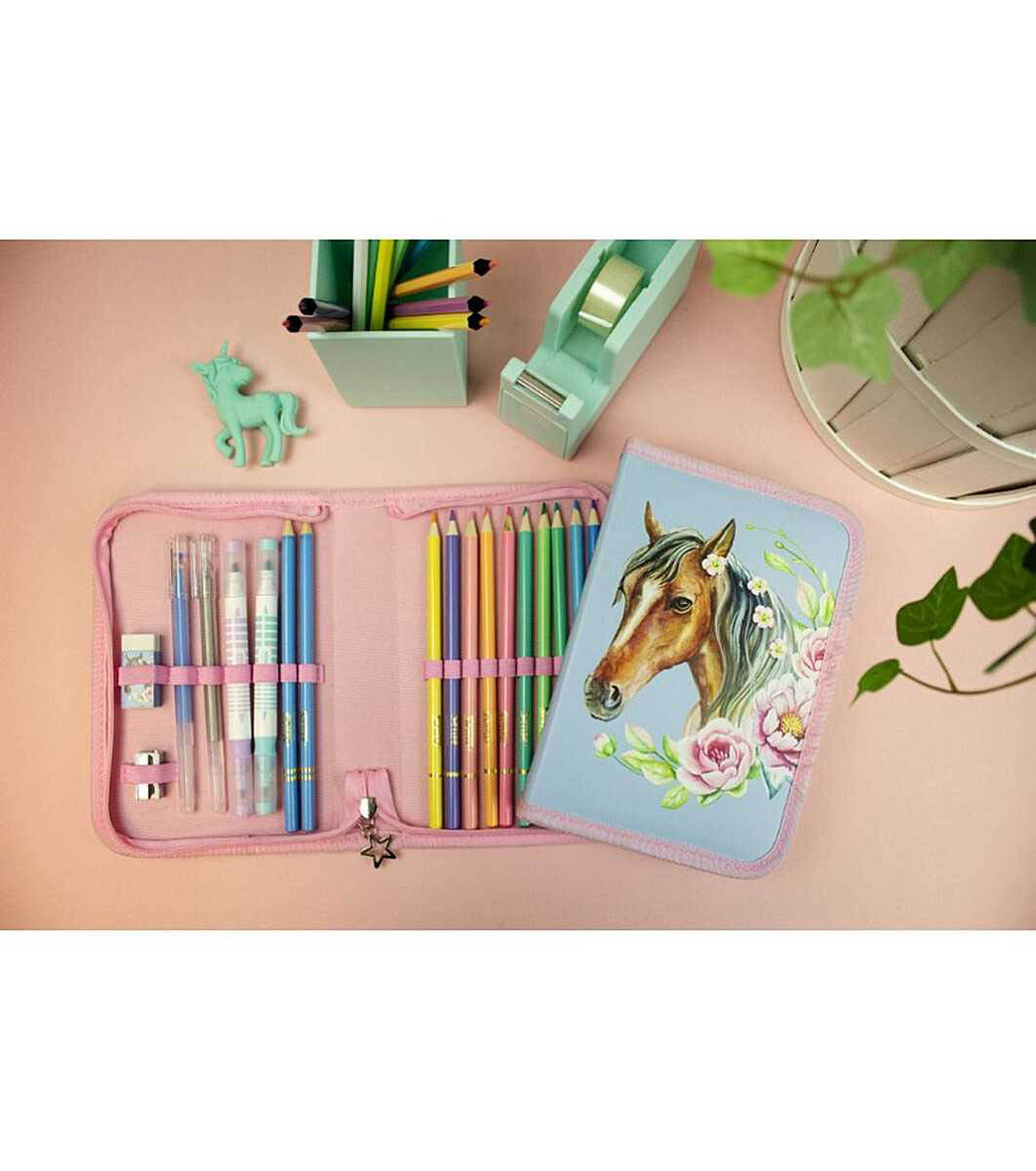 Пълен с 10 дървени цветни молива, 2 черни молива, 2 гел химикалки, 2 маркера, 2 химикалки с мастило, острилка и гумичка.