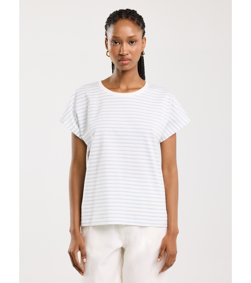 Памучна бяла дамска тениска на светлосиньо райе Aleksa