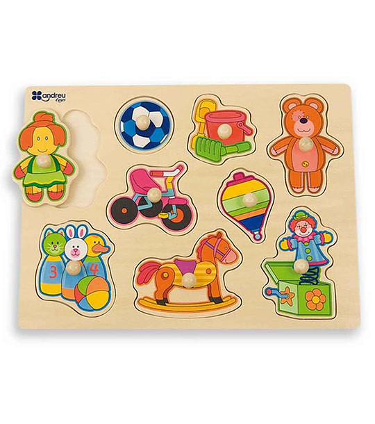 Пъзелът с дървени дръжки с изображения на играчки, съставен от 9 елемента, подходящ за най-малките деца.