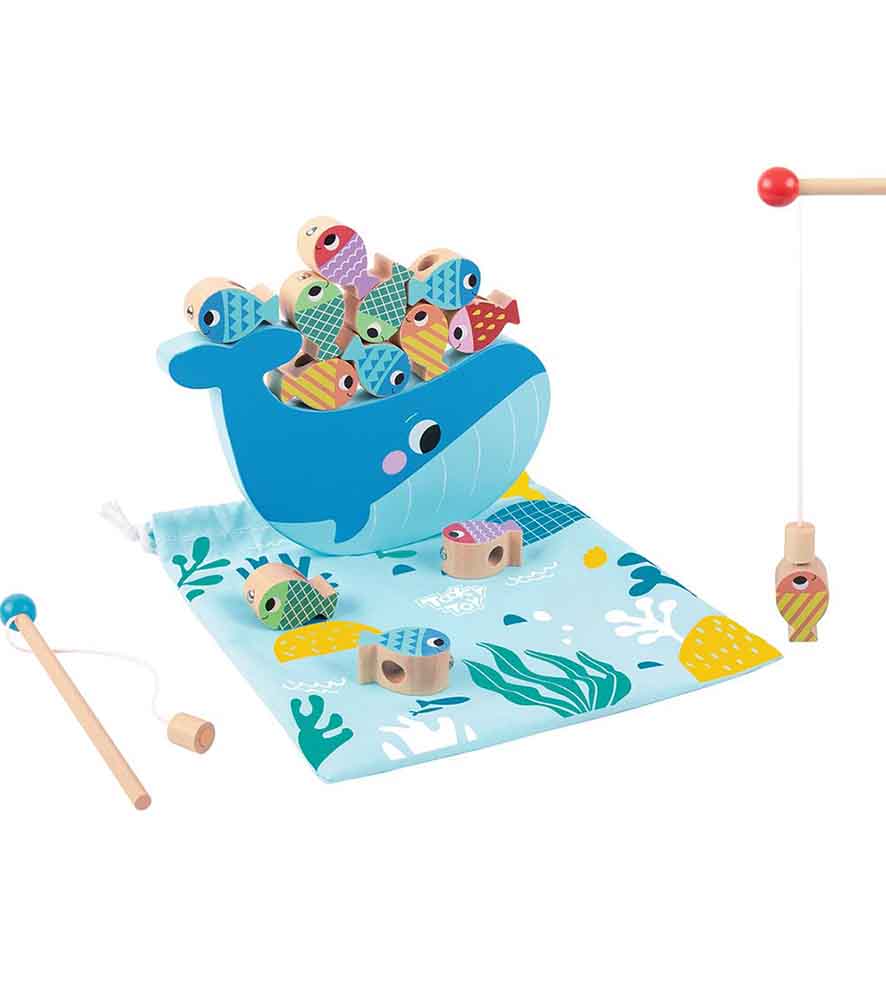 Играта включва: две въдички, 13 магнитни риби, кит за подреждане и красива платнена торбичка за съхранение, с красив дизайн, която може да се използва и като морско дъно.