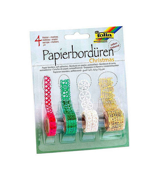 Комплект от 4 бр. х 1 м самозaлeпващи фини хартиени дантели в 4 различни цвята, размера и мотива, отличаващи се с оригиналност и прецизност на изработката. Подходящи са за декорация на всякакъв вид повърхности - дърво, картон, стъкло и др. Придават завършен вид, нежност и романтика на вашите скрапбукинг проекти, картички или албуми.