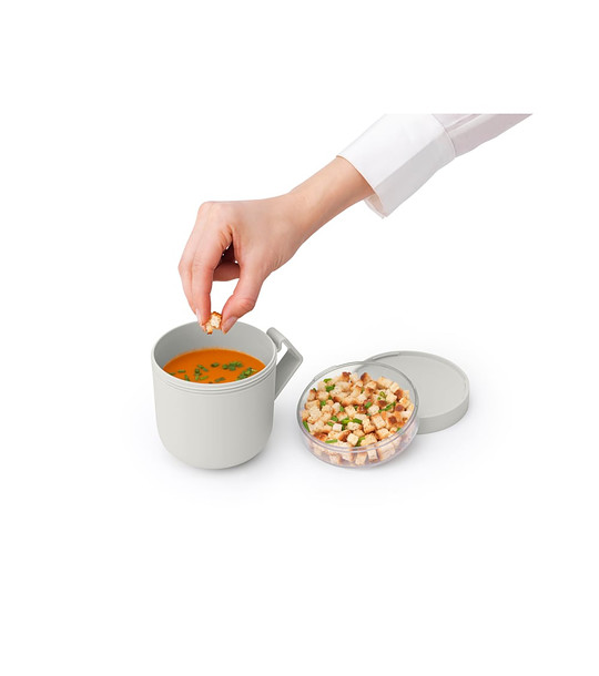 Малкият контейнер може да се използва за пренасяне на крутони или плодове, които не желаете да се смесват със съдържанието на чашата предварително.