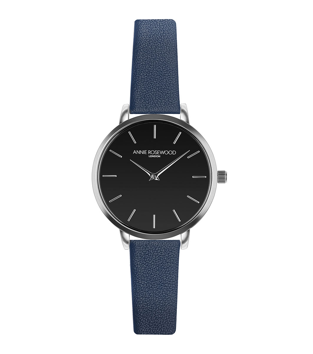 Сребрист дамски часовник с черен циферблат и каишка в синьо Forget