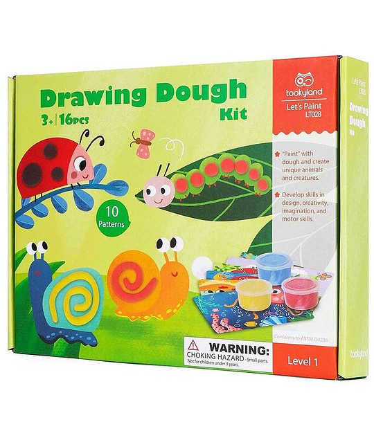 10 картинки и 6 цвята моделин, напълно безопасен, лек и пластичен, без мирис и без залепване по ръцете, очакват да бъдат довършени и разкрасени от малките дизайнери.