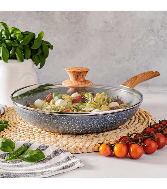 Тялото на съда от кован алуминий гарантира лекота на използване и най-добро разпределение на топлината, докато специалното покритие дава цялото качество на готвенето на камък.