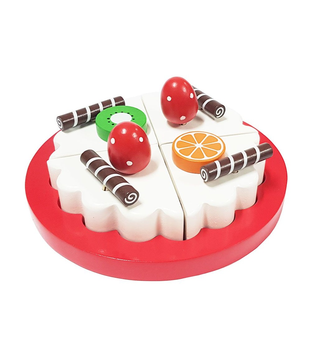 Тортата е с 4 парченца, които са свързани с велкро. Украсете с плодове, сложете шоколадовите пурички, разрежете на парченца и нека рождения ден да започне, сега ..