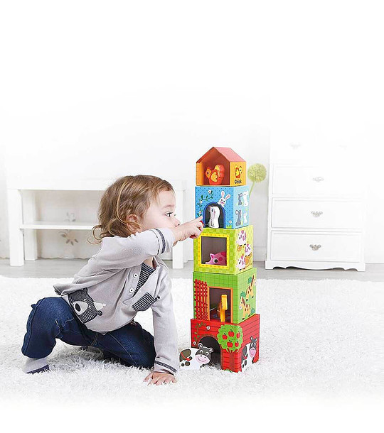 Освен, че трябва да ги подреди по големина, за да построи здрава кула, мъникът ще трябва да отгатне и къщичката на всяко животно и да го постави в нея. Всяко кубче-къщичка има изобразен различен брой от обитателя си, на различните страни, и ще помогне на малчугана да се научи по-лесно да брои. За по-удобно прибиране, накрая кубчетата ще трябва да се съберат и едно в друго.