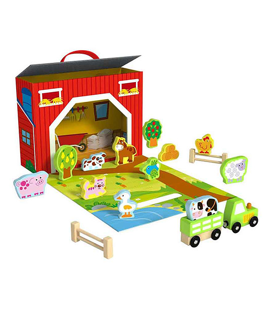 В комплектът са включени дървени фигурки на животни, тракторче с ремарке, дървета, храсти и огради.