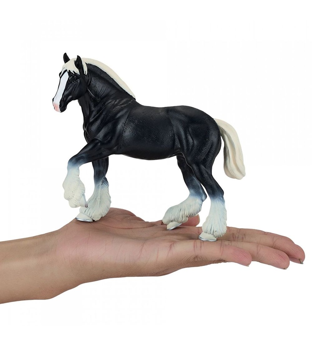 Предлагаме на вниманието Ви внушителна фигурка на кон черен Клайдсдейл на Mojo Animal Planet – символ на сила, елегантност и благородство! С характерната си мощна стойка, дълги бели "чорапи" и великолепна грива, тази фигурка пресъздава величието на една от най-емблематичните породи коне в света. Клайдсдейл е шотландска порода тежковозни коне. В миналото са използвани за селскостопанска работа и транспорт, а днес често се срещат в церемониални шествия, паради и реклами. Отличават се с дълги, пухкави косми около копитата и изящна осанка.