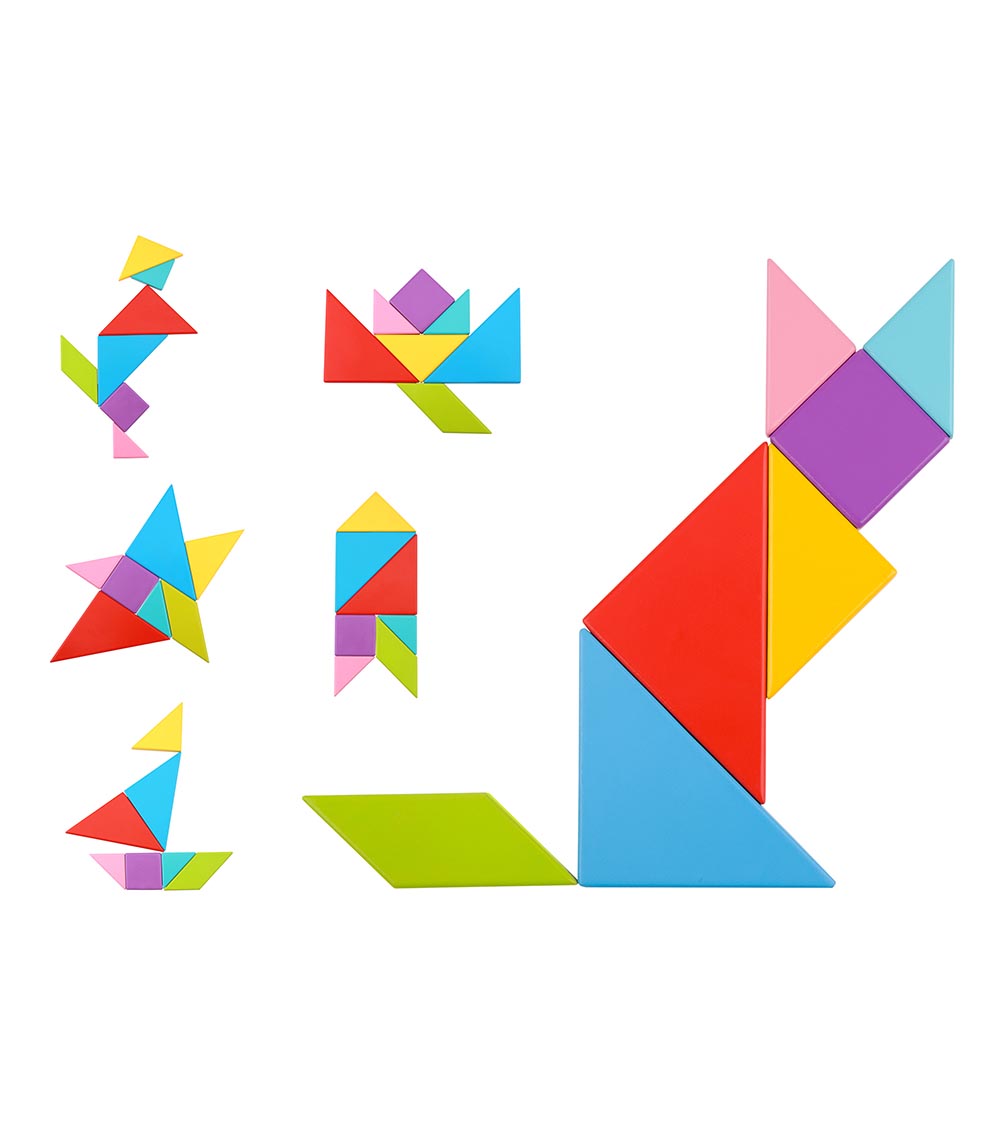 Използвайте образците, включени в комплекта и създайте различни изображения. Фигурите, които създавате трябва да съдържат всичките седем части. Частите трябва да са една до друга, но не е допустимо да се застъпват.