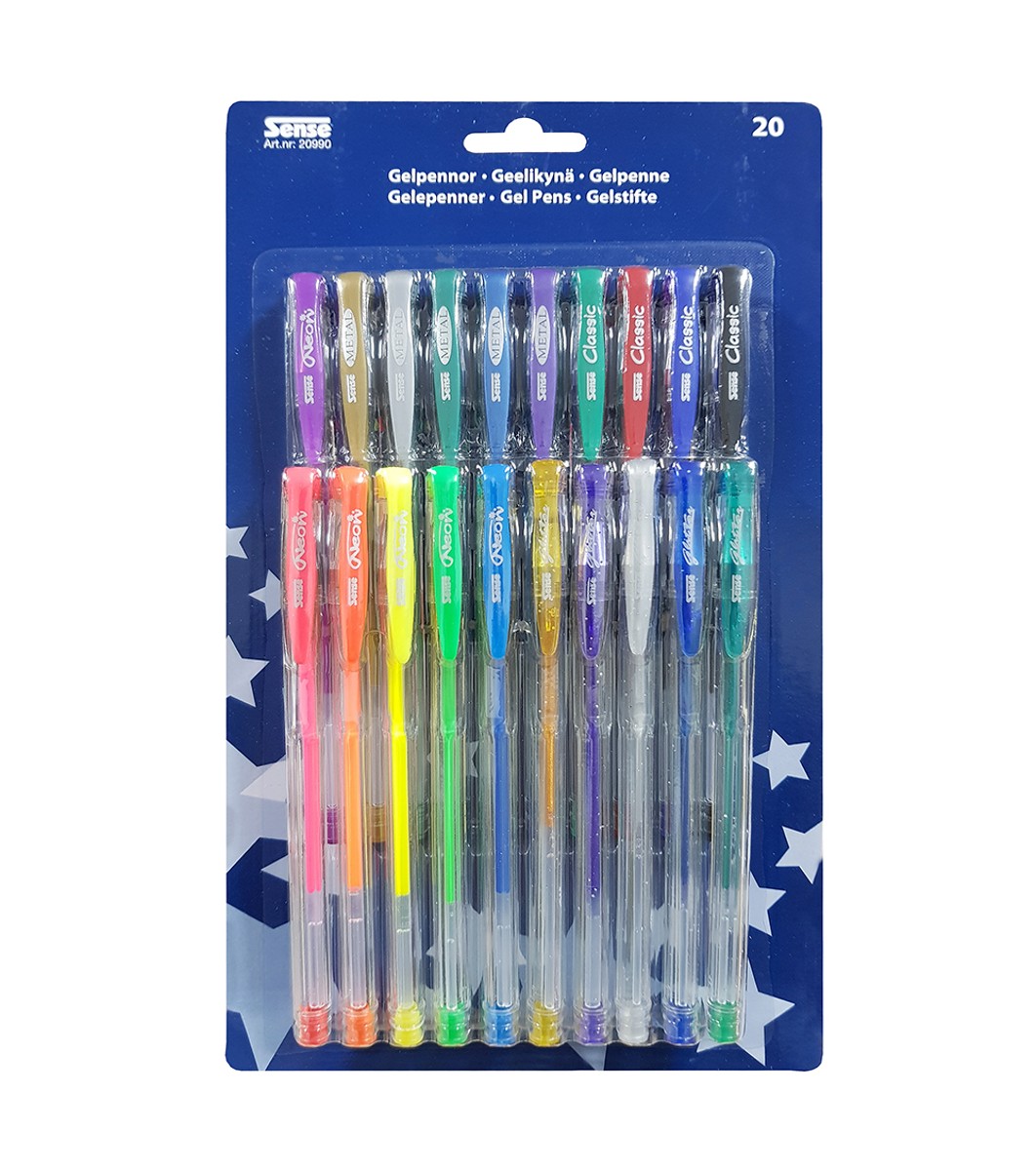 Комплект от 20 бр. цветни гел химикалки - 10 бр. стандартни и 10 бр. с брокат - подходящи за писане, оцветяване и различни творчески проекти.