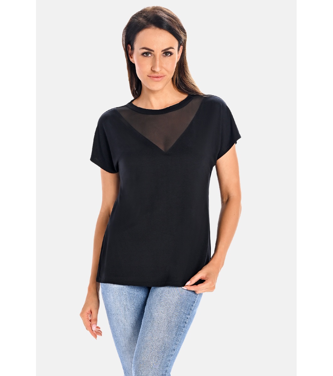 Дамска блуза от бамбук с мрежести панели на деколтето. Изработена от бамбук, блузата е не само екологична, но и мека, лека и дишаща, което я прави идеална за ежедневно и активно носене.