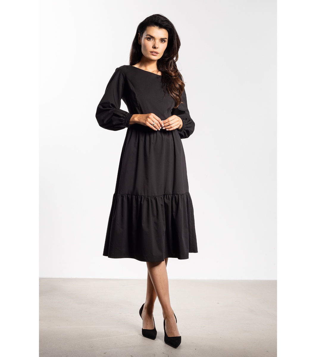 Дамска рокля миди с разкроен силует и дълъг ръкав. Горната част е леко вталена, с прехвърлян ефект отпред и оформено високо деколте. Талията е с ластичен набор. Полата е разкроена с широк долен волан и дължина под коляното. Ръкавите са дълги, леко обемни, с маншет и копче в долната част. На гърба има скрит цип за закопчаване. Долната част на полата е оформена с хоризонтален шев и мек набор.