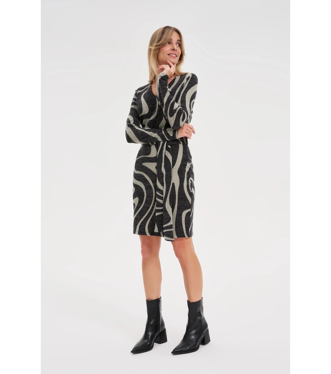 Дизайнът е с абстрактен принт, който добавя уникалност. Дължината е до коляното, а кройката е прилепнала, подчертаваща фигурата.