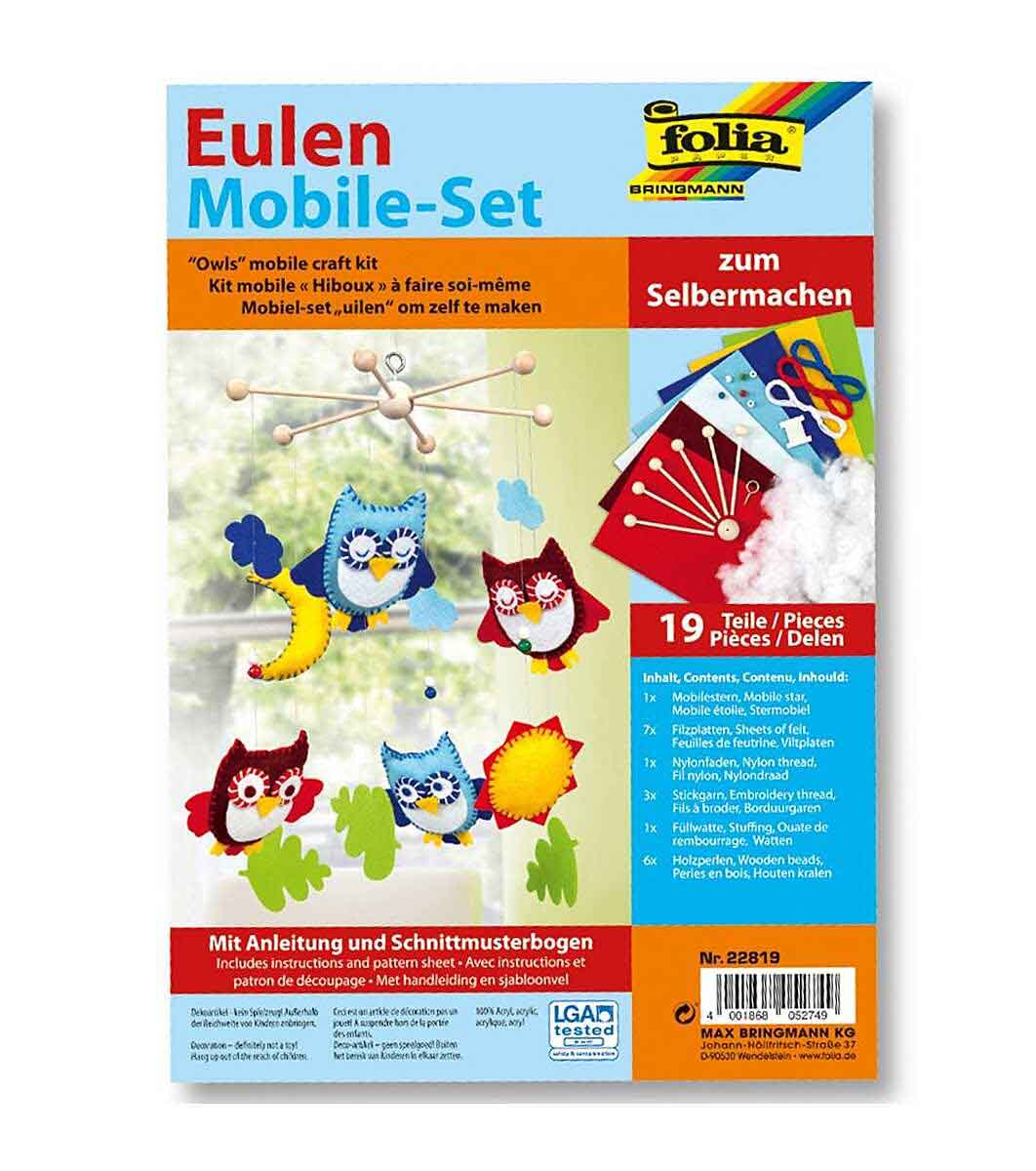 Комплектът се състои от 19 части, достатъчни за изработка на уникална висяща играчка: 1 дървена основа за закачване на висящите елементи; 7 листа разноцветен филц; 1 макара найлонова корда, достатъчна за нанизване на декоративните елементи; 3 бр. разноцветни памучни конци за шиене и бродиране; вата за пълнеж; 6 мъниста за декорация.