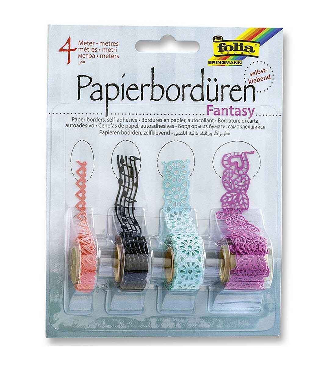 Комплект от 4 бр. самозалепващи фини хартиени дантели в 4 различни цвята, размера и мотива, отличаващи се с оригиналност и прецизност на изработката, всяка с дължина 1 метър. Подходящи са за декорация на всякакъв вид повърхности - дърво, картон, стъкло и др. Придават завършен вид, нежност и романтика на вашите скрапбукинг проекти, картички или албуми.