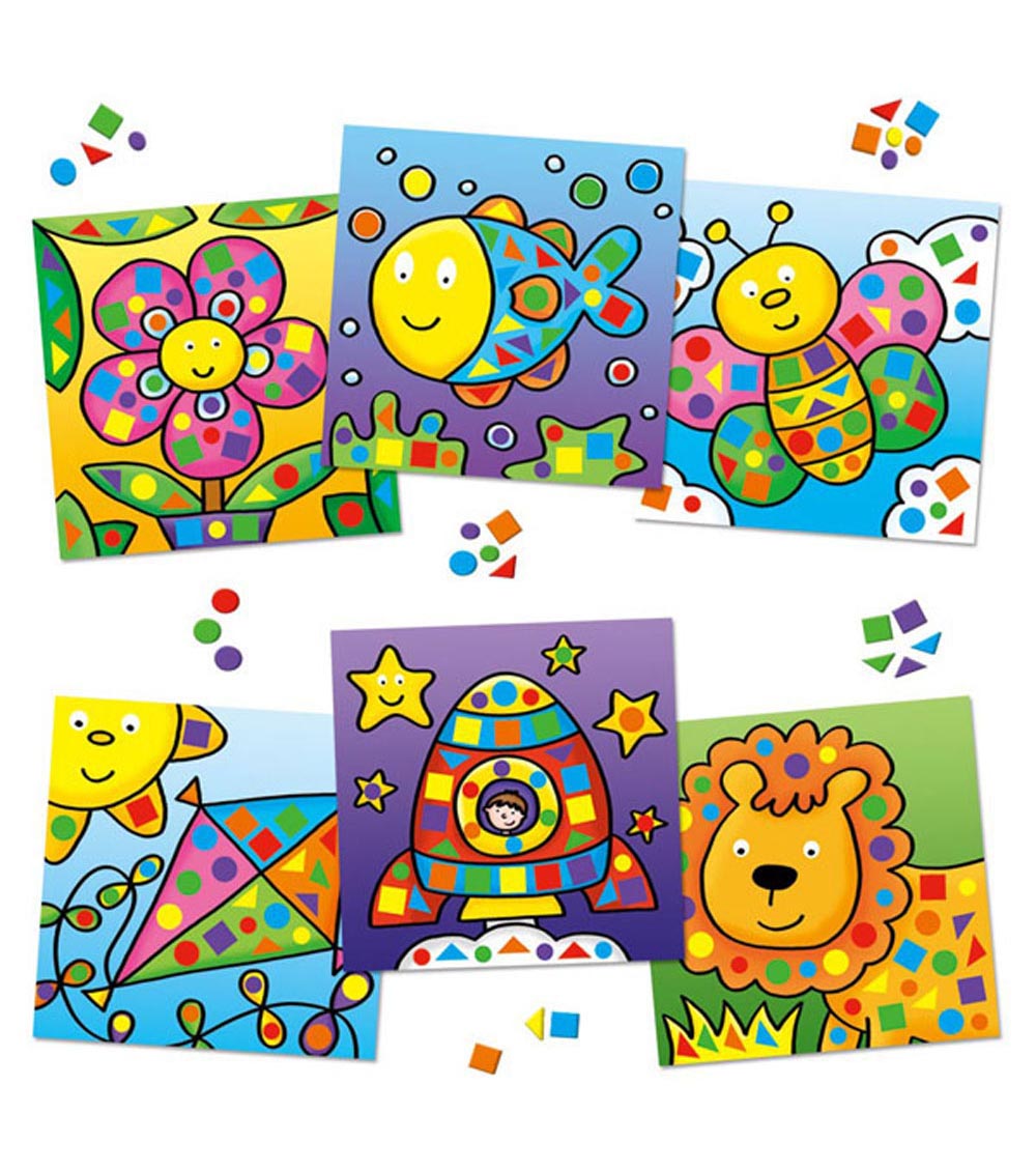 Забавен комплект, който развива фината моторика и помага за разпознаването на цветовете и формите. Децата трябва да свържат плочките с цветните форми от картинките за да получат шарени мозайки. Плочките са самозалепващи се, нямат нужда от лепило и са идеални за игра по време на пътуване.