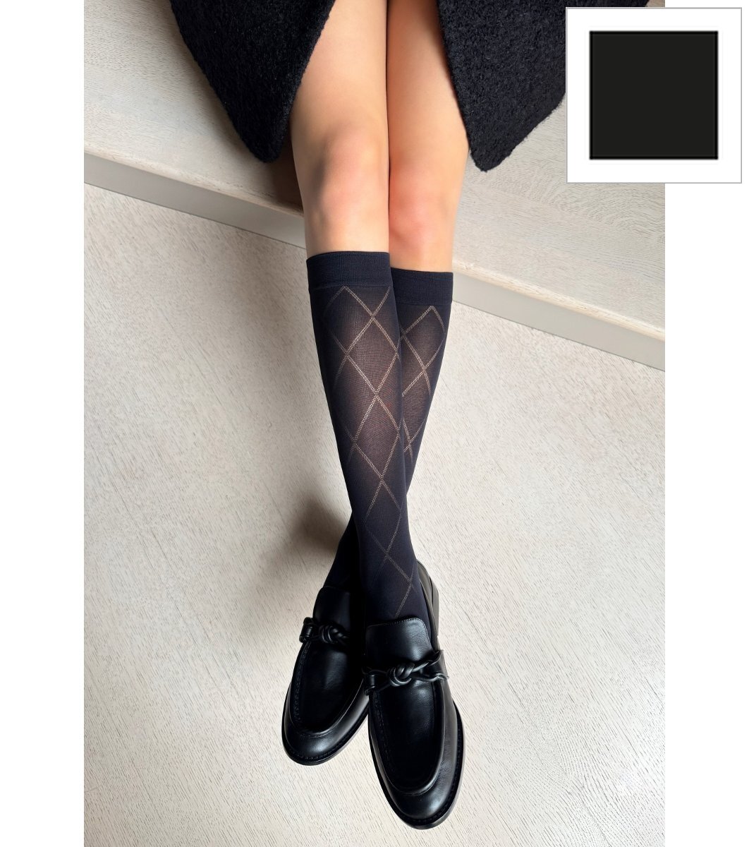 - Дамски чорапи до коляното с фин полупрозрачен ромбовиден десен по цялата дължина.